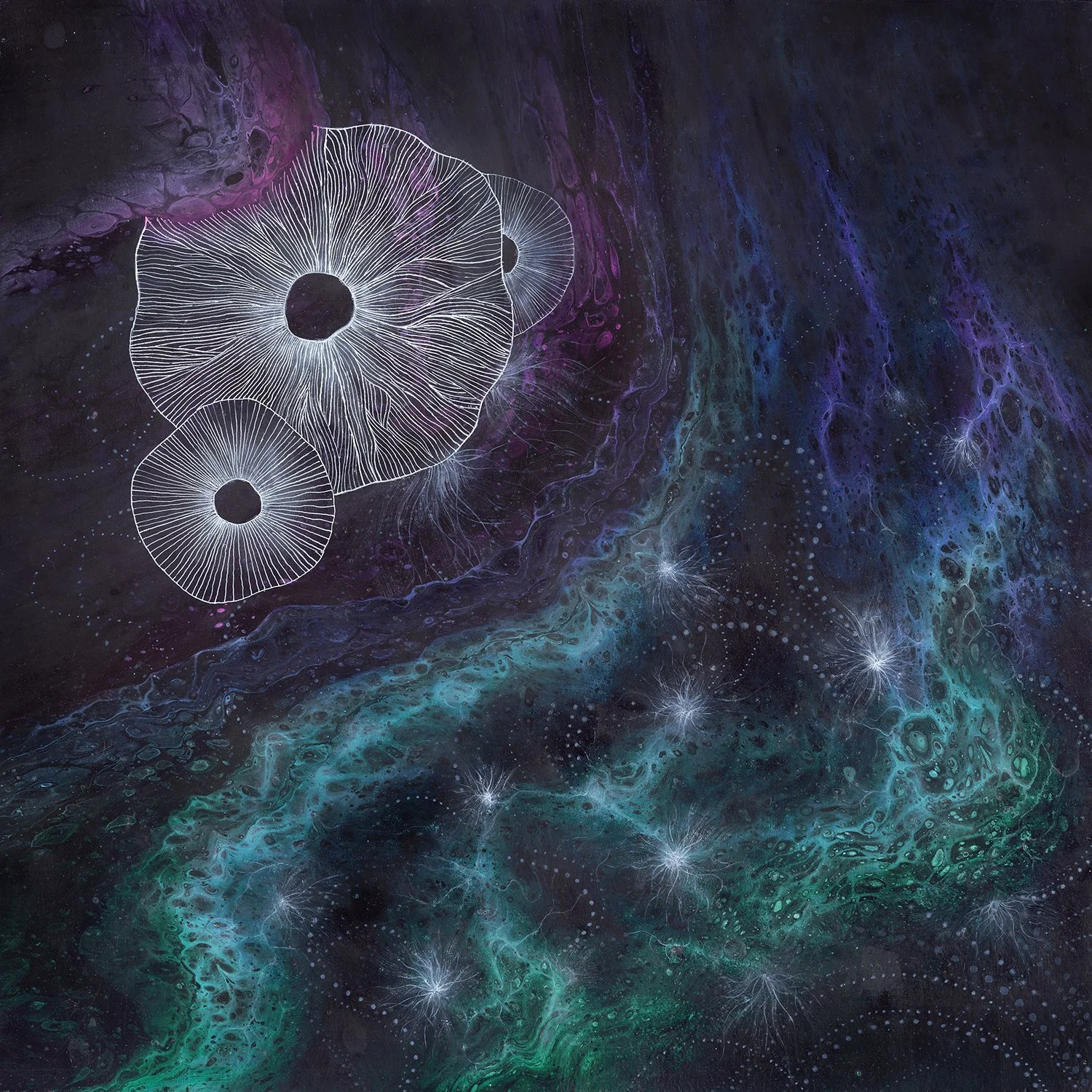 Fungi, like plants are decentralized organisms (non-fungible fungi) and this collection explores the different mycelial types which each have unique branching formations. Inspired by fungi foraging ventures this NFT collection features videos generated and rendered from original mixed media paintings.